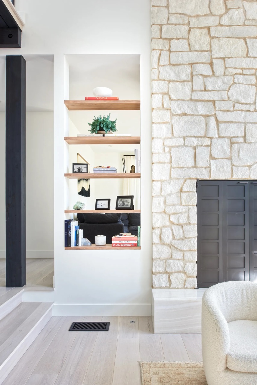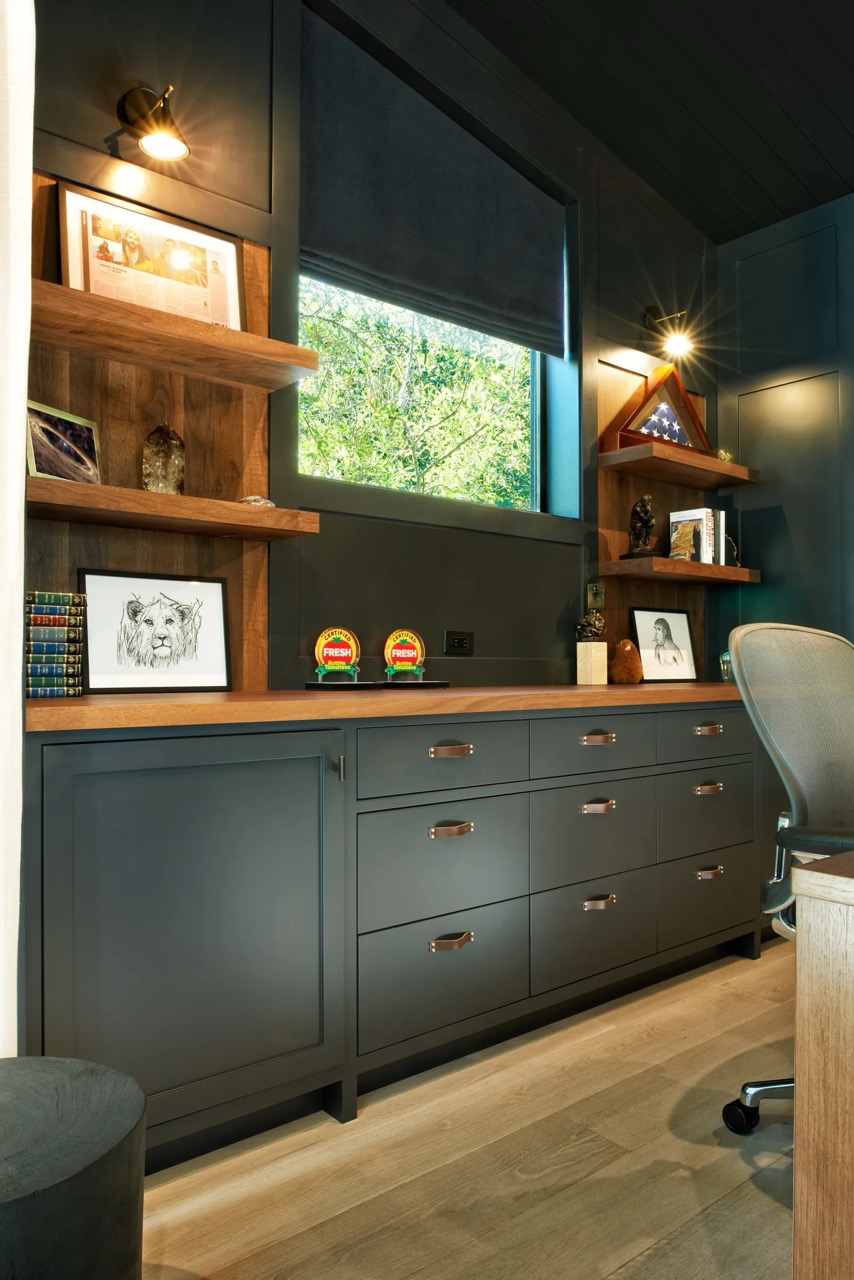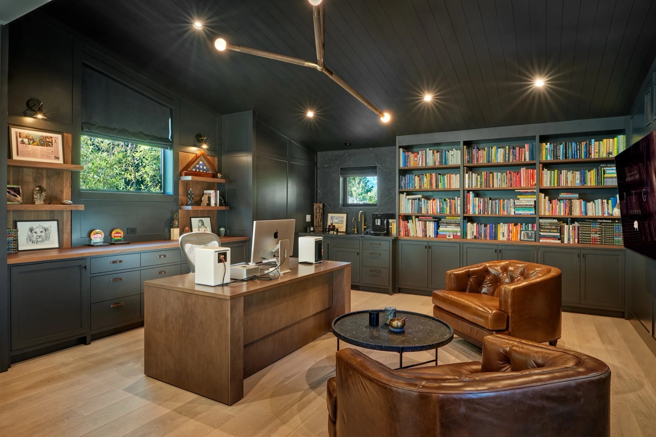 Dark, moody colors and built-in library shelving make this space relaxing and private.